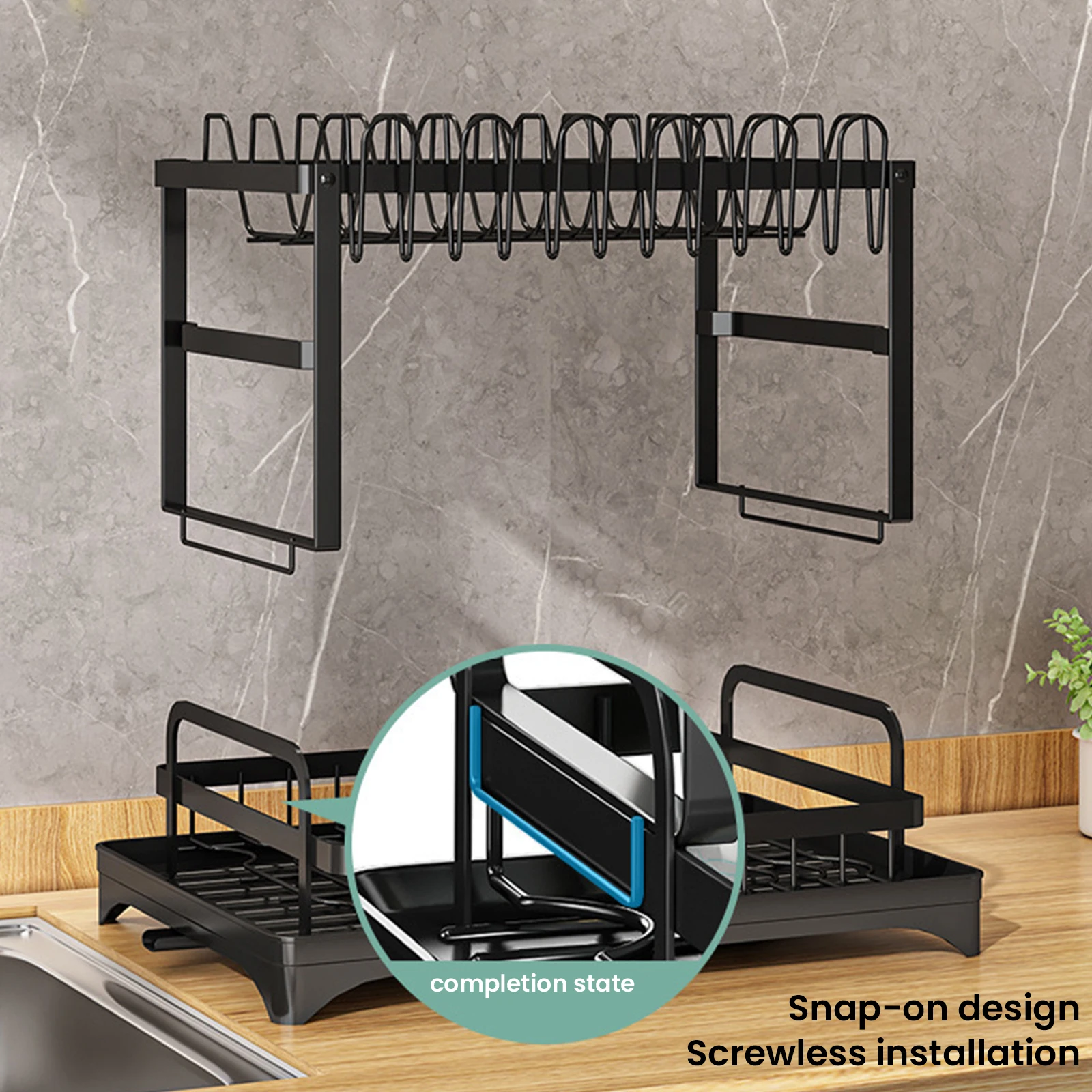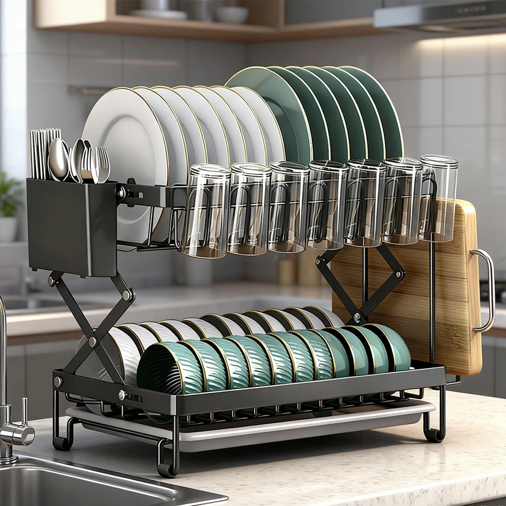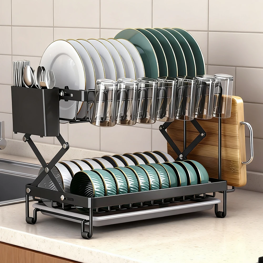 This complete dish rack set includes a double-layer dish rack, cutlery rack, cutting board rack, draining board, and 2 hooks. Quickly dry dishes and neatly store kitchen utensils, keeping your cooking area organized.
