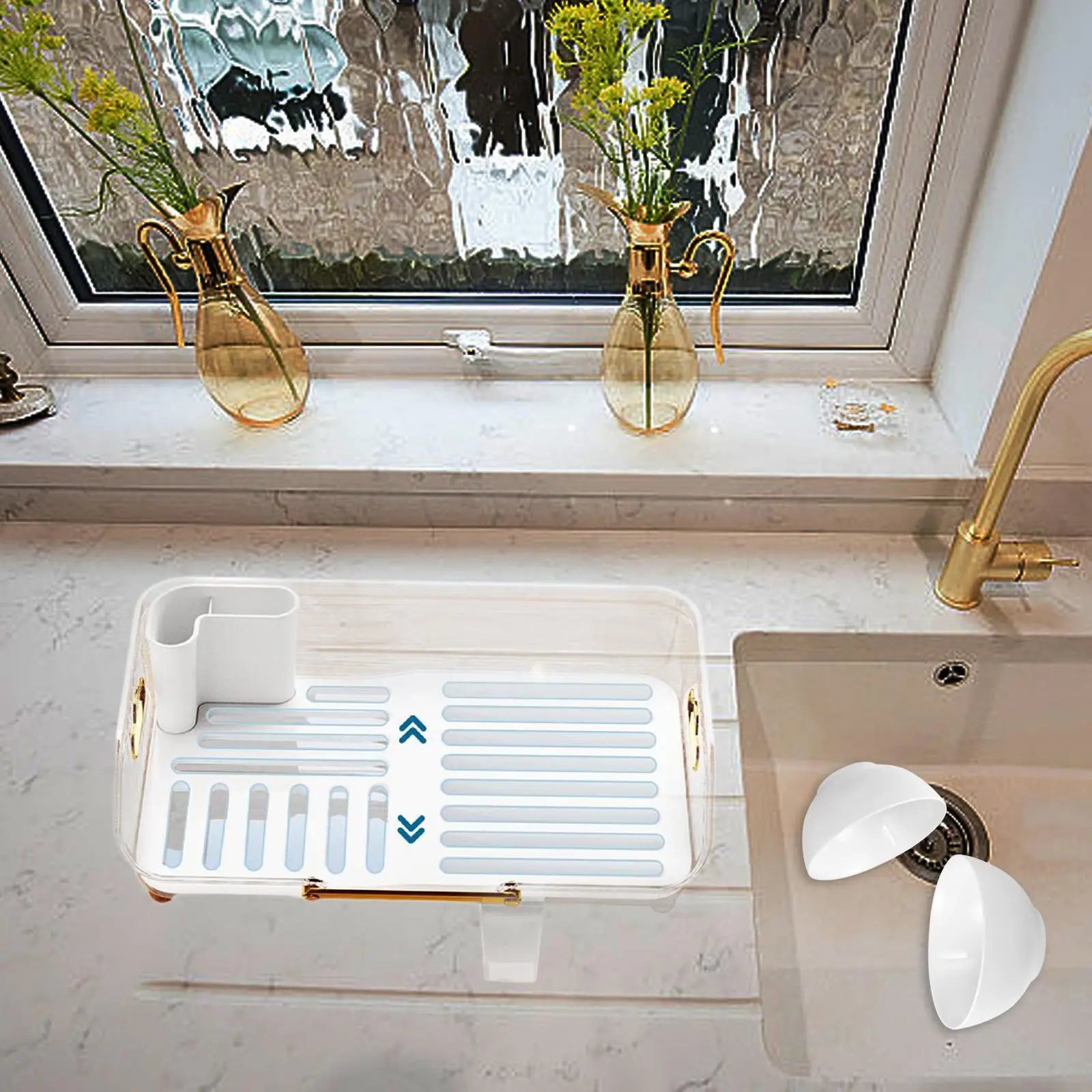 【Design】:Multifunctional dish rack with drainboard, utensil holder for kitchen organizer