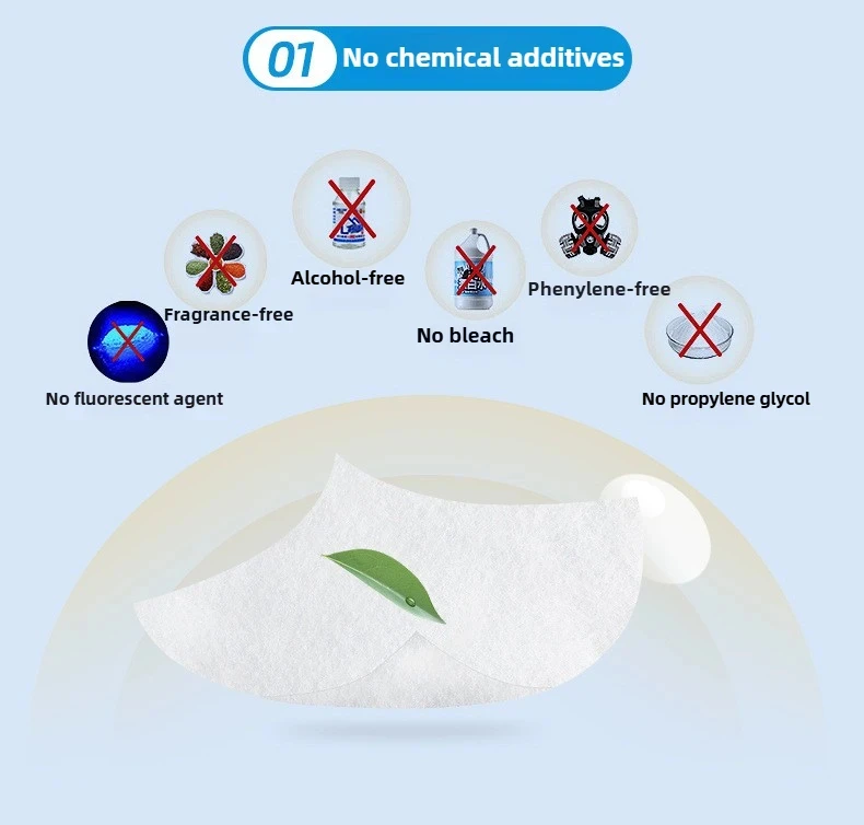 Cotton soft non-woven fabric, containing natural ingredients, reverse osmosis pure water, no additives, no alcohol, no fragrance, no fluorescent agent, no bleach, no benzyl alcohol, no malonic acid, can be used with confidence