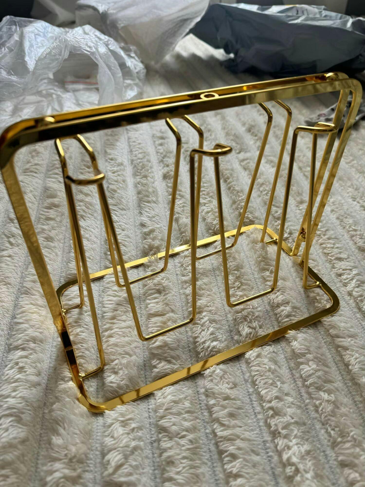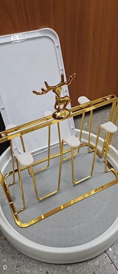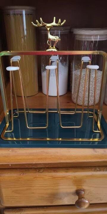 - ColorGolden - Material: Iron. - Size: 26.50X24.20X15.00cm/10.41X9.51X5.89in. - Countertop cup hanging rack has 6 branches, and each branch has anti-slip feet with rubber end keep cup in place and protects contacts surface of drinkware. Cup Drying Stand with Drain Tray - Selected high-quality and sturdy materials, stylish and decorative, environmentally friendly and odorless. Cup Storage Shelf - Special placement method can drain the water quickly and keep your glass cups clean and tidy. Desktop Cup Organizer - Reasonable design for convenient use and space, looks modern and elegant. - Versatile as drying rack, coffee mug holder, mug tree, cup rack, cup hanger, coffee rack, tea cup holder stand, etc.1 Storage Rack 1 x Drain Tray