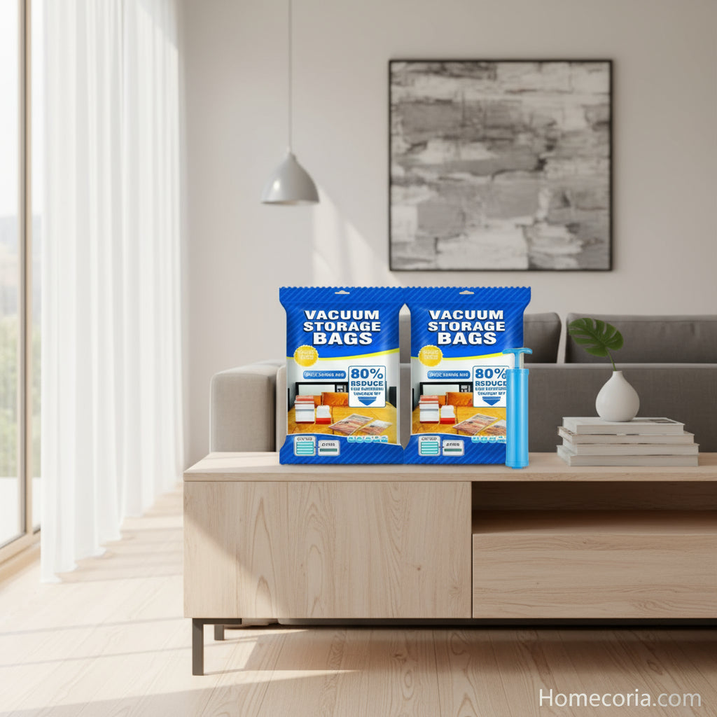 This set includes four vacuum storage bags and a hand pump to efficiently compress and protect your belongings. Designed to reduce volume and save space, the bags are made from durable, airtight material that preserves items from dust, moisture, and odors. The included hand pump ensures easy air removal for optimal storage, making it ideal for travel, seasonal clothing, or home organization.